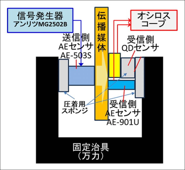 図9は従来型AEセンサと試作したQDセンサ®(第3世代)の特性確認試験のブロック図を示す。センサと媒体との間は信越化学のシリコンオイルによる湿式で行っている。使用した主な装置の仕様は下記の通り。