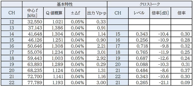 ここで、表4に示した用語の説明をする。中心f[kHz]とは、中心周波数で、QDセンサ® (第3世代)の検出電力がピークになる周波数である。Q値概算とは、Q値=中心周波数÷半値幅の式で求められる値で、その値の大きい方が他の周波数の選択性がいいことを示す。±Δfとは、検出電力がピーク時の半分になる周波数の幅 (半値幅)である。出力Vp-pとは、ピーク周波数での電圧[V]のことで、正弦波形のPeak-to-Peak値である。レベルとは、隣接CHがクロストークして出力する電圧[V]である。倍率とは、クロストークノイズの出力電圧/本来の信号からの出力電圧の値である。[dB]とは、倍率の表記方法の違い、20×log10(倍率)[dB]である。感度については表1の出力が大きいものが良い。また、Q値については、周波数に依存しない仕上がりとなっている。