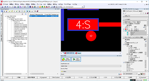 メンターの『Xpedition xPCB Layout』では、『Valor NPI』を使用したDFM検証と結果確認をすべて同一画面で実行できるため、設計者が『Valor NPI』アプリケーションの操作を習得していなくても、『Valor NPI』のDFM解析を利用できる。