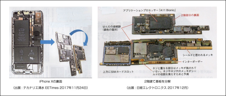 iPhoneXの2階建て構造のプリント配線板はスペーサーにより接続され、その空間には多数の部品が搭載されている(写真3)。2枚の基板のひとつはロジック基板でアプリケーションプロセッサを搭載したメイン基板で、他は通信ICなどを搭載したRF基板となっている。ロジック基板は10層でRF基板は8層、各基板の表層から2・3番目がMSAP基板の60μピッチになっている1)、 2) 、3)、4)。