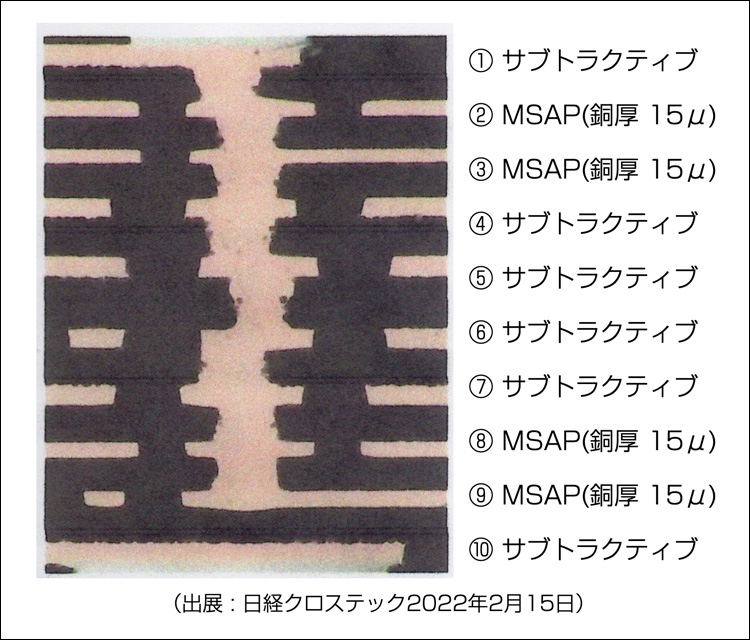 MSAPはiPhoneXに採用されるまでは主としてCSPのパッケージやメモリー基板に採用されていた。MSAPをスマートフォンのメイン基板に使用したのはiPhoneXが初めてであり、その後、他社も同様の2階建て構造とMSAPを採用し、この方式がスマートフォン配線板のデファクトスタンダードとなった。