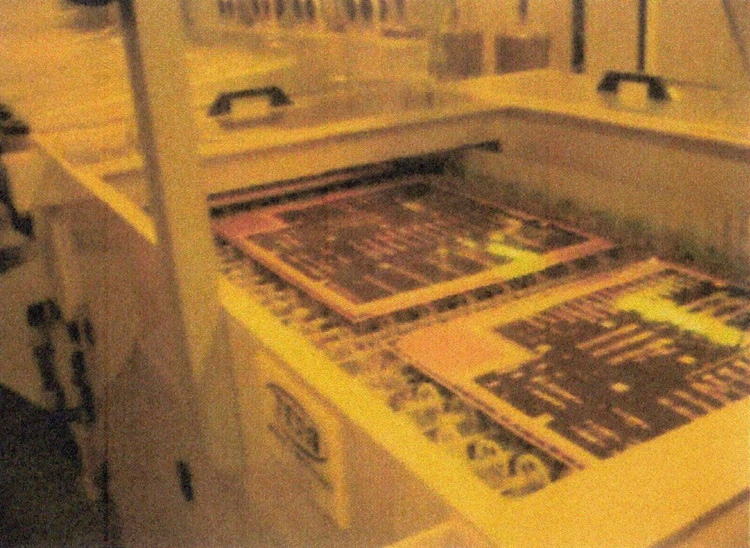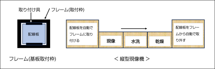 <縦型現像機>は、先ず基板をロボットでフレーム(枠)に取り付け、フレームをマシーンに垂直に取り付け無接触で現像・水洗・乾燥工程を搬送させる。基板からの取り外しもロボットを使用する(図5)。