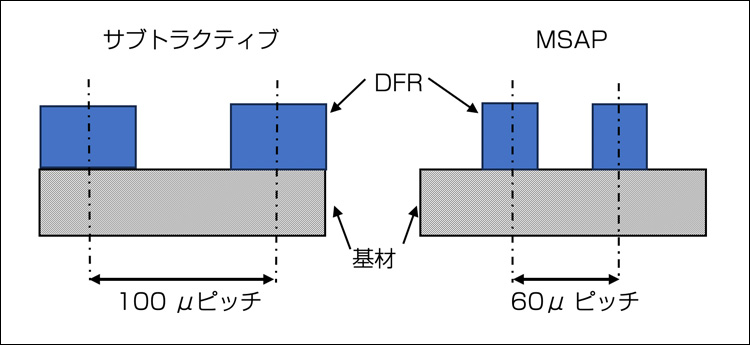 図4にDFR現像後のサブトラクティブとMSAPの断面を示す。図で判るように、MSAPの60μピッチのDFRは縦に長く下地との密着面積が小さい。ローラ搬送タイプの水平現像機をMSAPに使用すると、ローラがDFRに接触しDFを傷つけて歩留まりを低下させてしまう。そこで、MSAP用の現像機として無接触でDFRを傷つけない<縦型現像機>が登場した。