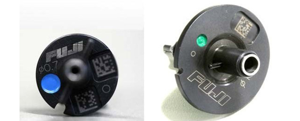 まず、生産品種の切り替えは、基板搬入時に基板に刻まれた基板ID(2次元コード)読み取り、自動的に生産プログラムを切り替えるシステムを提供している。ランダムな生産計画に容易に対応でき、オペレータによる生産プログラムの選択ミスも発生しない。『NXTⅡc』では、自動的に前基板の生産が終了したステージから、逐次生産プログラムを切り替えるシームレス段取り替え機能や、バックアップピンの配置を自動的に行う、パックアップピン自動配置機能を用意しており、生産品種の切り替えやバックアップピンの配置作業など、オペレータが介在することなく行える。バックアップピンの配置は、オペレータレベルで30分程度(6本配置:当社調査データより)かかる作業であるが、『NXTⅡc』ではXYロボットによりピン配置をし、配置された位置も画像処理にて確認を行うため、オペレータの作業時間が『0』で、かつ、正確にピン配置を行うことができる。さらに、『NXTⅡc』ではノズルに2Dコード(図5)が刻まれており、装置自身がどの位置にどのようなノズルが置かれているか、自動的に認識することができる。そのため、ノズルを装置から指示された通りに置く必要もなく、どの位置に置いても、ミスなく、自動的にノズルを実装ヘッドに装填することができる。作業時間と確認時間が大幅に削減されることになる。