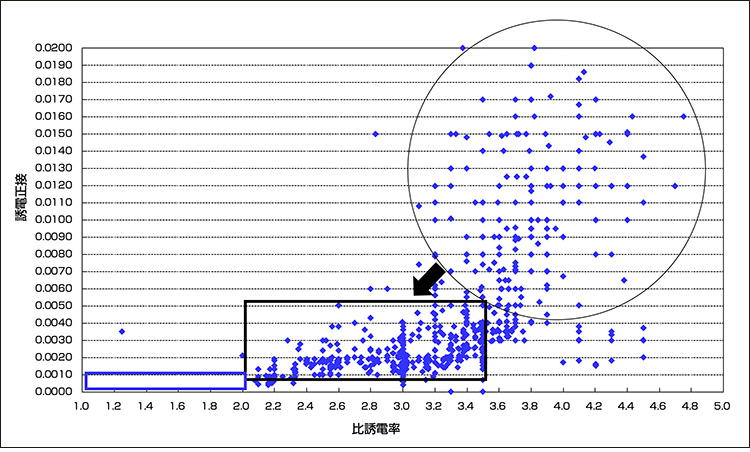 拡大図を精査してみると概ね3つの大きなグループに分けることができる。図15で左下のプロットの無い部分が、今後は、“比誘電率”は2.0以下で、“誘電正接”は0.0010以下の材料開発が目標となるのではないかと推察している。