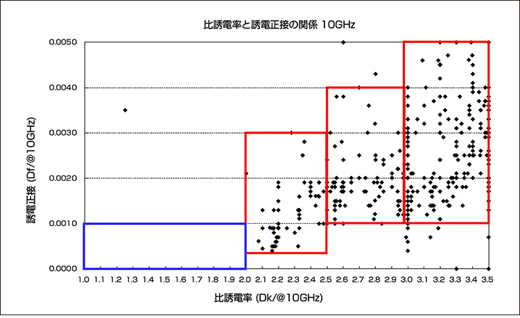 これは、世界で市販されている銅張積層板1,042種類の中で、10GHzで測定された783種類の銅張積層板の“比誘電率”と“誘電正接”の関係をプロットして求めたものであり、“比誘電率” 5.0以下、“誘電正接” 0.0200以下の範囲のものを示した図である。広く分布していることが分かる。右上から左下の方に分布の重心が移っていることも読み取ることができる。