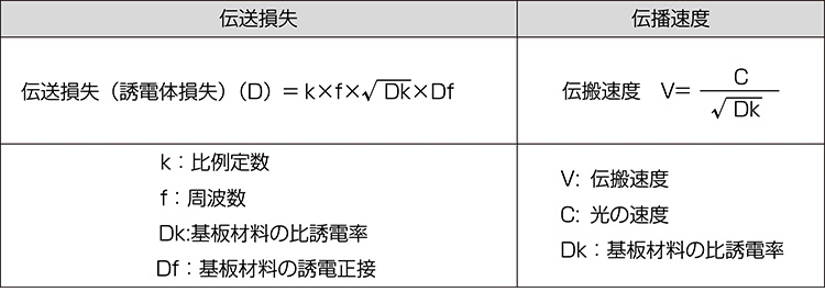 表1に示すように周波数が高周波側に移行することによって、伝送損失が大きくなる点である。伝送損失は表1に示す式で現わされ、使用する周波数は固定されるため、周波数が高くなればなるほど伝送損失は大きくなる。