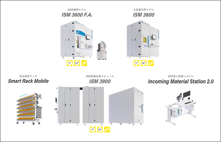 フリーロケーション管理にも対応し、キャスター ・ バッテリ ・ Wi-Fi通信により設置場所を選ばず柔軟に運用できる。出庫時にはLEDランプで対象部品を通知し、取り間違いを防止。仕切り位置の変更も容易で、収納物に応じたサイズ調整が可能であるため、様々な部品に対応する。受け入れテーブルや自動倉庫、外棚、上位システムとの連携も可能で、ISM管理システムによる一括管理に対応。複数台の連携や生産ラインでの一時棚としての活用も可能である。