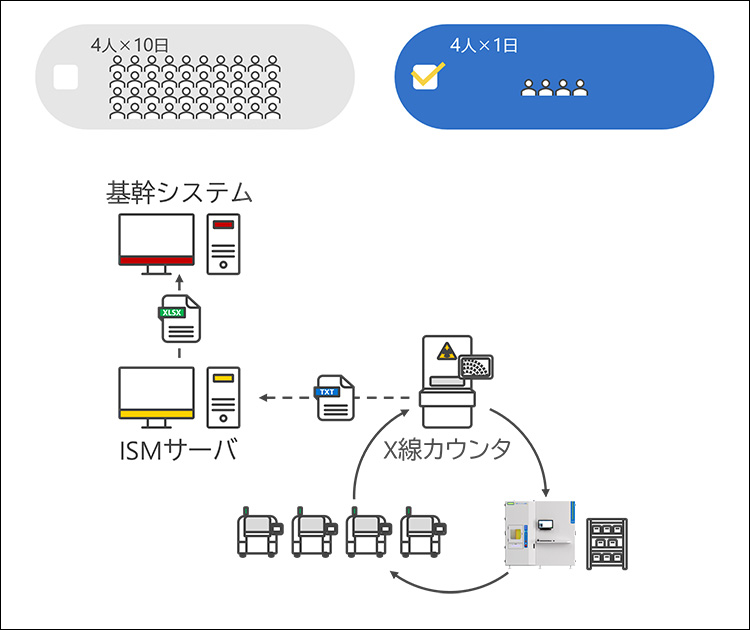 ISM 3600を7台導入し、X線カウンタとの連携をご提案(図5)。すべての部品はX線カウントを行った後に倉庫へ戻す運用とし、数量管理の精度向上を図った。