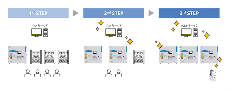 自動化のメリットを十分に理解いただいた上で、部品の受け入れや搬送工程まで含めたトータル自動化を実現するフェーズである。インカミングマテリアルステーションや搬送システムとの連携により、部品管理のさらなる効率化と省人化を図ることが可能となる。