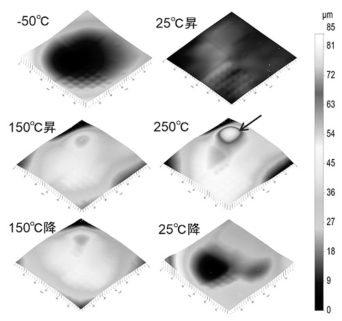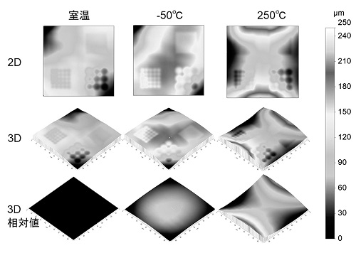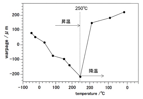 図4から、基板Aは-50℃では中央部が約数十μm凸となり、250℃では辺縁部の2辺が大きく凸になって残りの2辺が大きく凹んだことが分かる。
