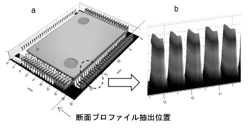 パッケージAの表面上各点の高さ情報により作成された3D形状図を図7aに、一部のピン(点線で囲んだ部分)の拡大図を図7bに示す。