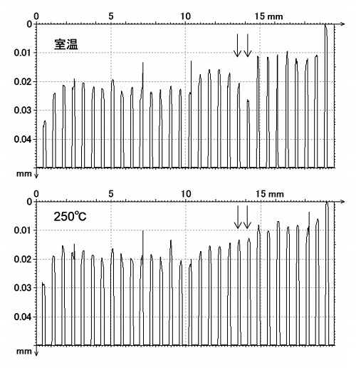 図8 室温と250℃でのQFPの1長辺のピンの高さプロファイル