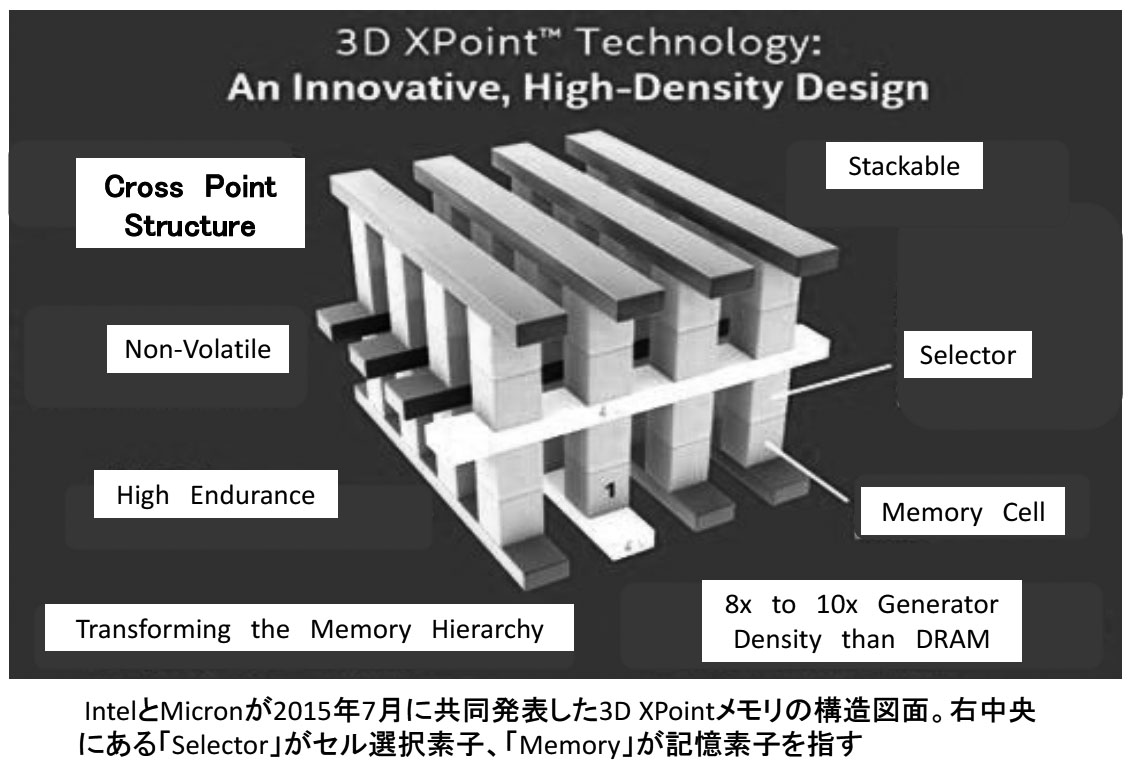 3D XPointメモリは、インテルとマイクロン・テクノロジー社が共同開発し、両社から2015年に大々的に発表された不揮発性メモリである。DRAMに比べて記憶密度が10倍、NANDフラッシュメモリに比べてアクセス速度が1000倍、書き換え寿命はNANDフラッシュメモリの1000倍といわれている。3D XPointメモリの構造は図6のように発表されているが、詳細な技術は発表されていない。業界ではある程度の推定は行われており、記憶部はカルコゲナイド材料の相変化メモリで、セル選択素子は米国の発明家オブジンスキーが1960年代に発見した「オボニック・スイッチ」といわれている。カルコゲナイド材料は、高温にすると合金(低抵抗)状態になり、徐冷するとアモルファス(高抵抗)状態のどちらかとなって不揮発性メモリとなり、電圧印加によって導通と絶縁