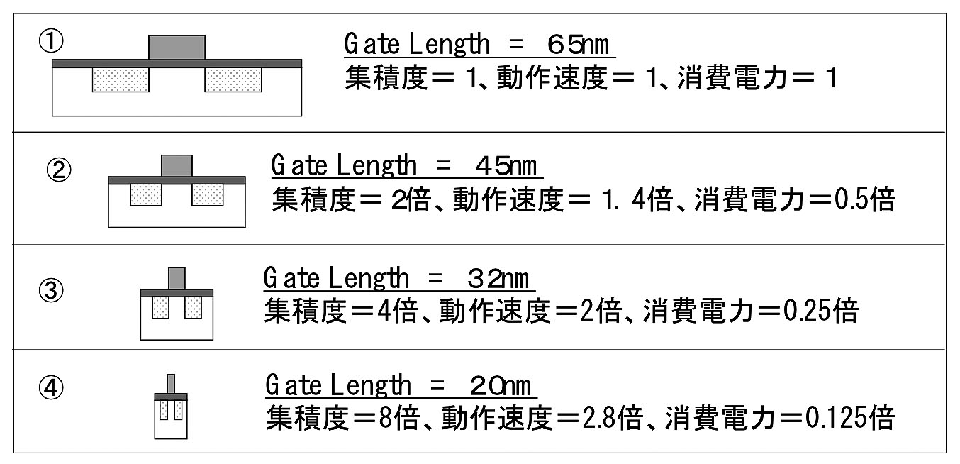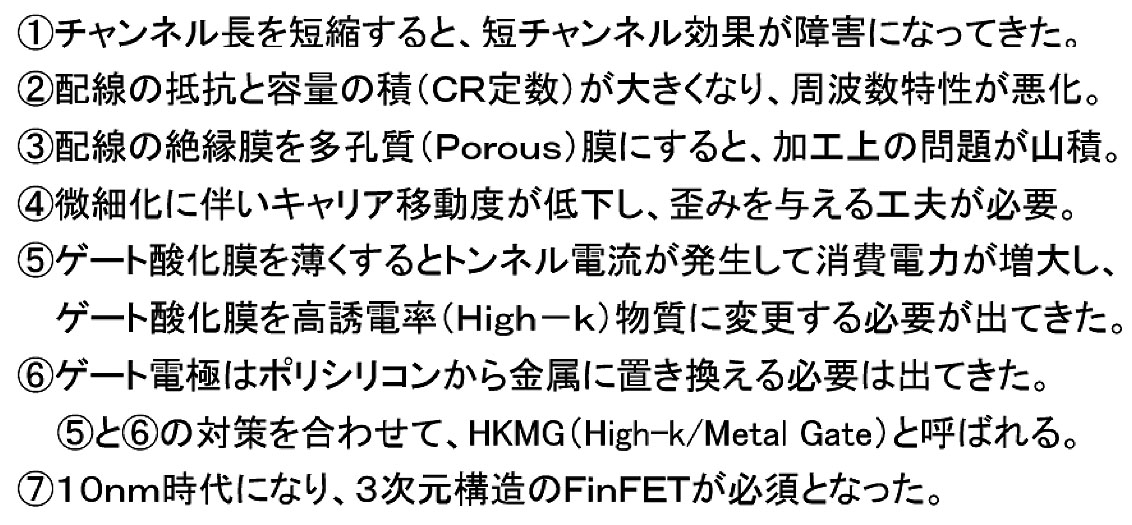 順調に微細化が進んでいたCMOSLSIも、2000年ごろの100nm付近を境にして、単にパターンを微細化するだけでは性能の向上が図れなくなり、多くの弊害があらわれるようになった。