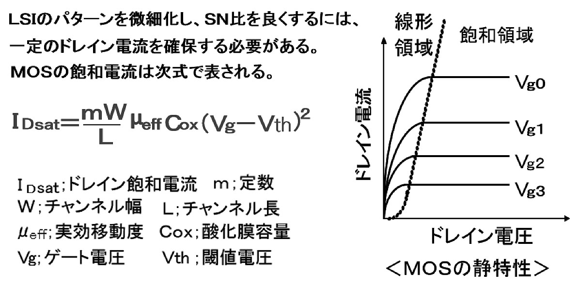 MOSトランジスタの寸法を微細化することにより、性能も集積度も向上してきたが、微細になると駆動電流(IDSAT)を大きくとることが難しくなってきた。駆動電流は、図6の式で表され、これを大きくするには、チャンネル幅(W)を大きく、実効的移動度(μeff)を大きく、酸化膜容量(COX)を大きく、ゲート電圧(Vg)を大きく、チャンネル長(L)を小さくすれば良いことが式から読み取れ、このため涙ぐましい努力が行われている。