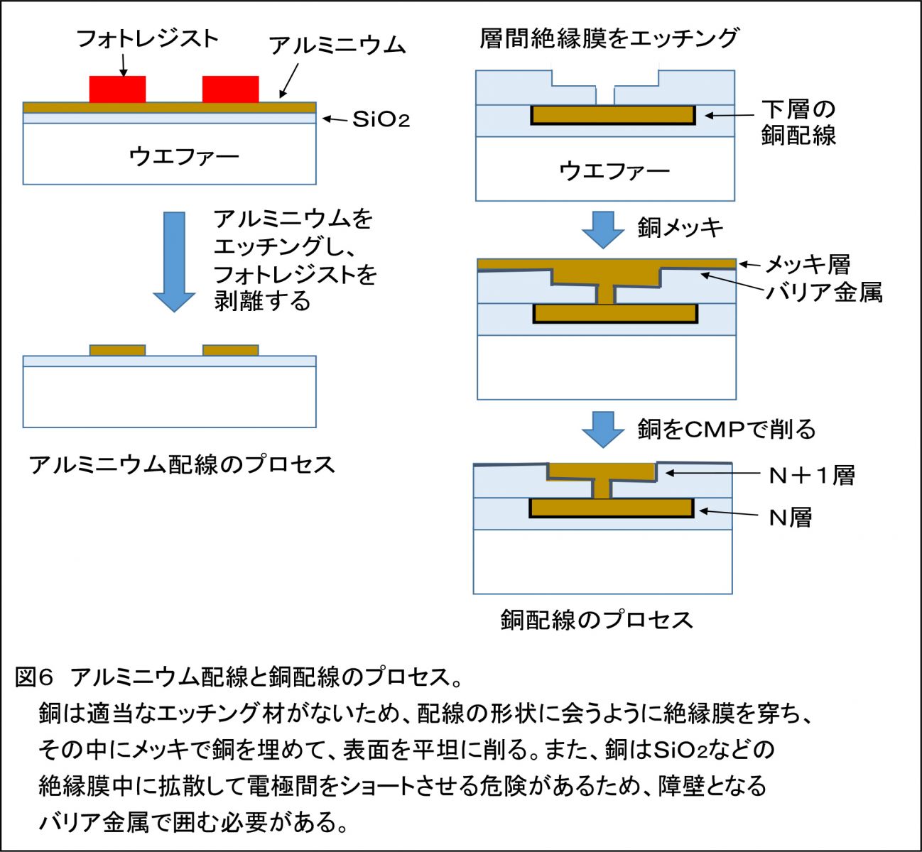 しかし、銅はアルミニウムと同様のプロセスは採用できない。すなわち、プラズマエッチングに適した化学反応を示す材料がなく、図6右に示すような複雑なプロセスになる。まず層間絶縁膜をエッチングして銅配線を形成すべきパターンを穿つ。次いで銅をめっきで埋め、表面に余分についた銅をCMP(Chemical Mechanical Polish)で削って平坦化する。これをダマシンと呼んでいる。ダマシンとは、ダマスカス地方の技法のことで、日本にその技術が渡来して象嵌となって宝石などを埋め込んで削り出すのに用いられている。銅はアルミニウムに比べて抵抗率が約2/3なので、現在のLSIの主流となっている。