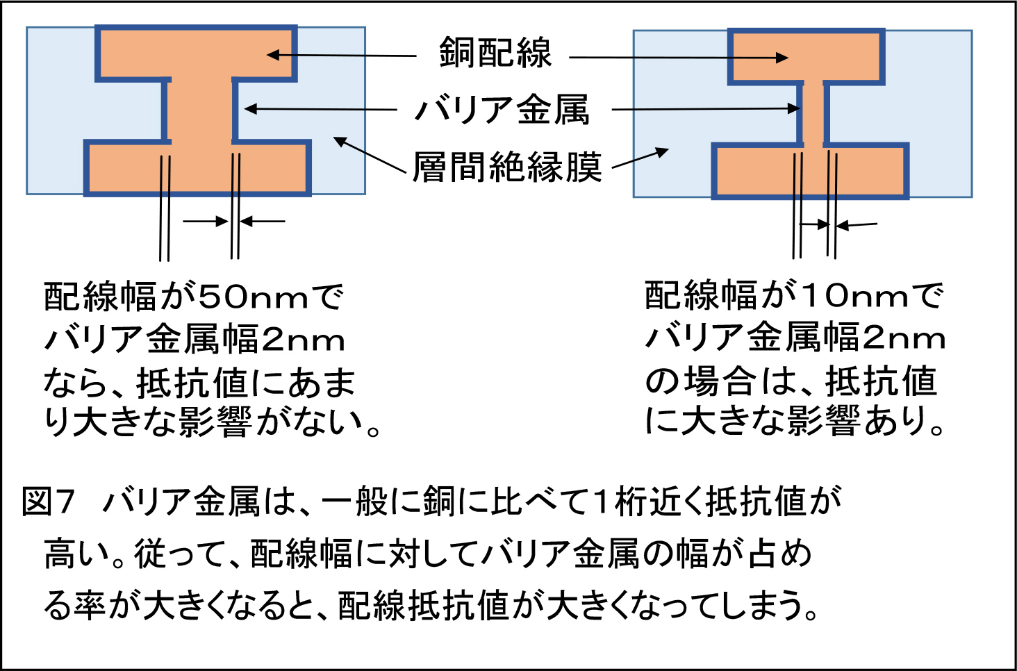銅配線のプロセスは複雑なダマシンが必要なので、配線層が10層にもなるとコストアップの原因となり、また銅の研磨で発生する銅の微粒子の洗浄などは厄介な問題である。しかし、もっとも厄介な問題は、SiO2やBPSG(Boro Phospho Silicate Glass)など層間絶縁膜中を銅が拡散することである。LSIを使用中に電極間に電界がかかると銅分子が拡散して電極間をショートしてしまう。これを防ぐため、図7のように銅配線の回りに銅の移動の障壁となるバリア金属を挟む必要がある。バリア金属として、チタン(Ti/TiNの積層)が用いられ、マンガン、ルテニウム、コバルトなども検討されているが、図7に示すように配線が微細になると、配線中にバリア金属の占める割合が大きくなって、折角抵抗率の低い銅を用いても抵抗率の高いバリア金属のために平均した抵抗が大きくなってしまう。たとえば、バリア金属層が3nm(両サイドで6nm)でも銅の幅が54nmなら、銅の占める幅が90%あって大きな問題はない。ところがバリア層を2nm(両サイドで4nm)と薄くしても銅の幅が8nmに時には、銅の占める幅が2/3になってしまいアルミニウムから切り替えた意味がなくなってしまう。したがって、バリア金属の種類の検討とともに、いかに薄くするかが大きな問題となっており、現在も完全な解決策は確立していない。