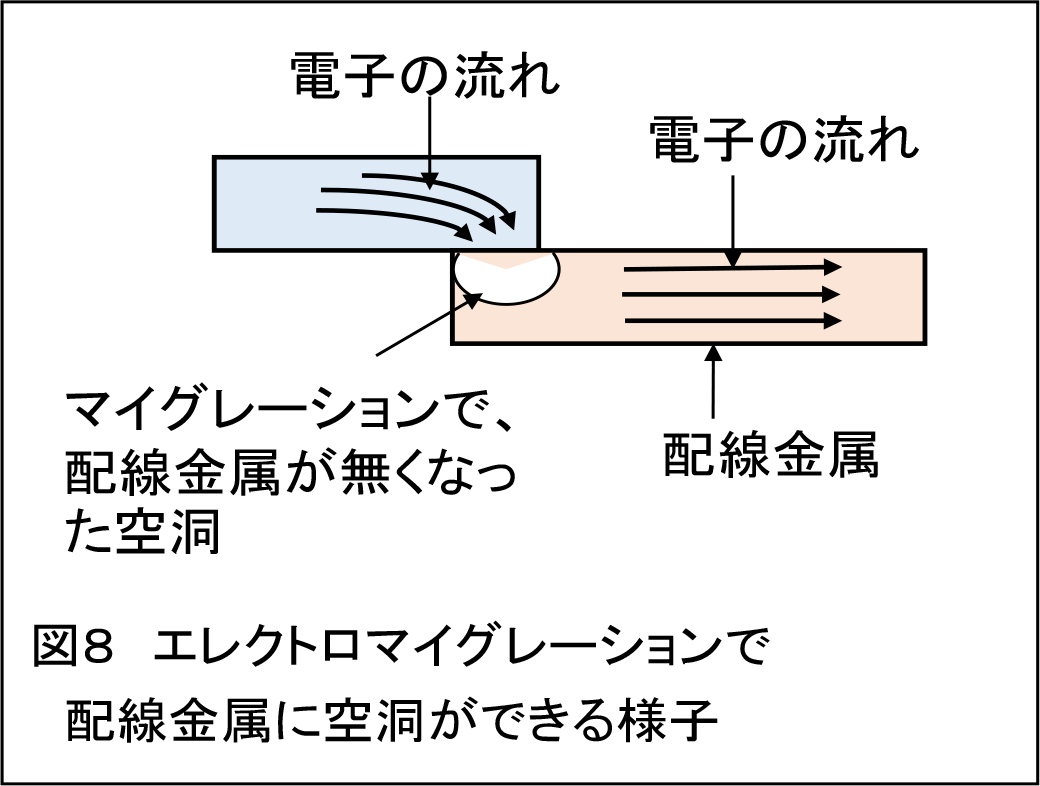 また、配線の断面積が減少するにしたがい、電流密度が大きくなって(すなわち、流れる電子の数が増えて)、電子のエネルギーで配線を形成している原子が動かされる図8のような現象が起こる。電子に比べて原子の質量は数万倍であるから、軽い電子があたっても平気と思われるかも知れないが、ネズミが100万匹、一度に象にぶつかれば象も動くだろう。これをEM(エレクトロマイグレーション、Electro-Migration)といって、LSIを使用中に断線に至る重大問題である。アルミニウムに比べて銅の方がEMが起こりにくいが、それでも完全解決とは言い難く、バリア金属の種類や成膜条件などの検討が進められている。