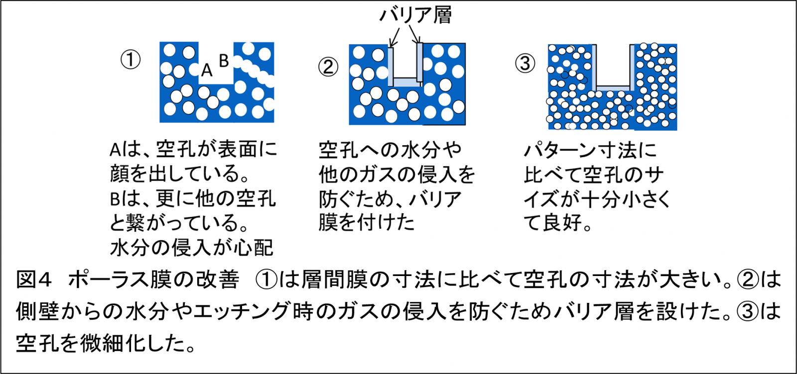 ポーラス膜の問題点の一部を図4に示す。図4の①Aは、空孔がエッチングした溝の表面に顔を出している場合で、その後、溝の中に銅配線する場合の薄いバリア金属の均一性がなくなる。Bのように空孔が連続していると、ここを水分が侵入してk値を上げてしまって空孔の効果がなくなってしまう。