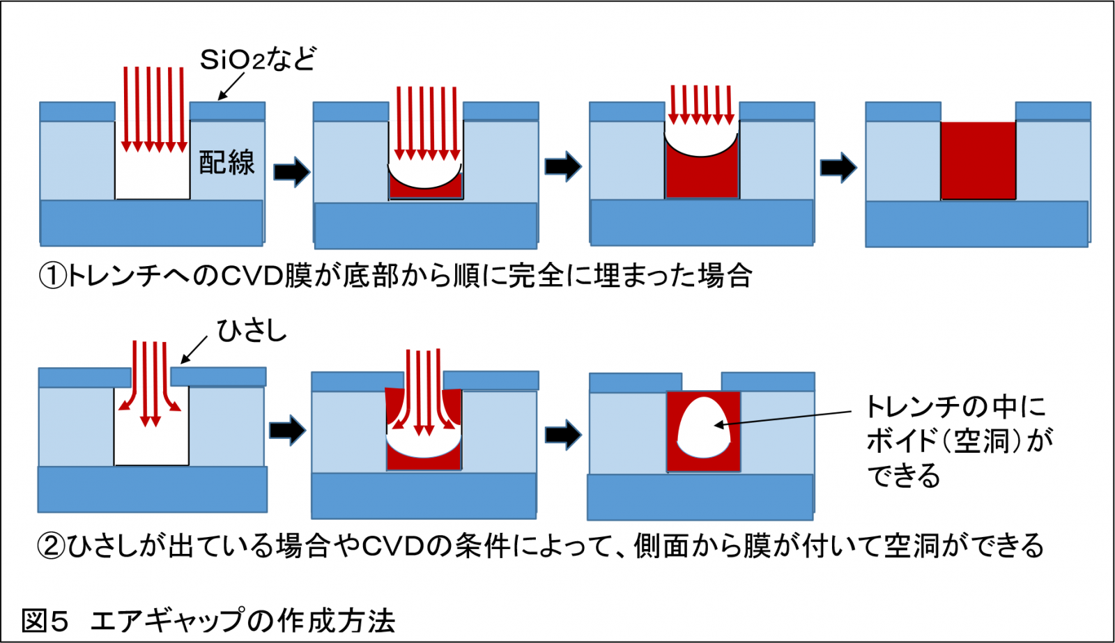 配線間の狭い部分のk値を下げることができるので、空洞の効果は大きい。 図5は、CVDで空洞ができる様子を表している。すなわち、CVDのガス流がトレンチの底まで垂直に流れていると、図5の①のようにトレンチ底から順に膜が成長する。