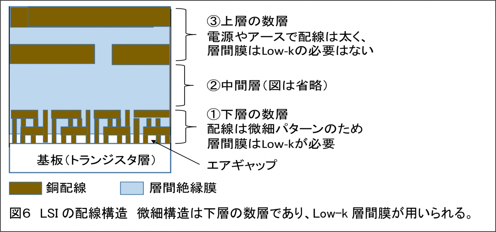 図6は、LSIの配線の様子を表したもので、一般に下層の配線は微細であり、層間膜としてLow-kが要求される。