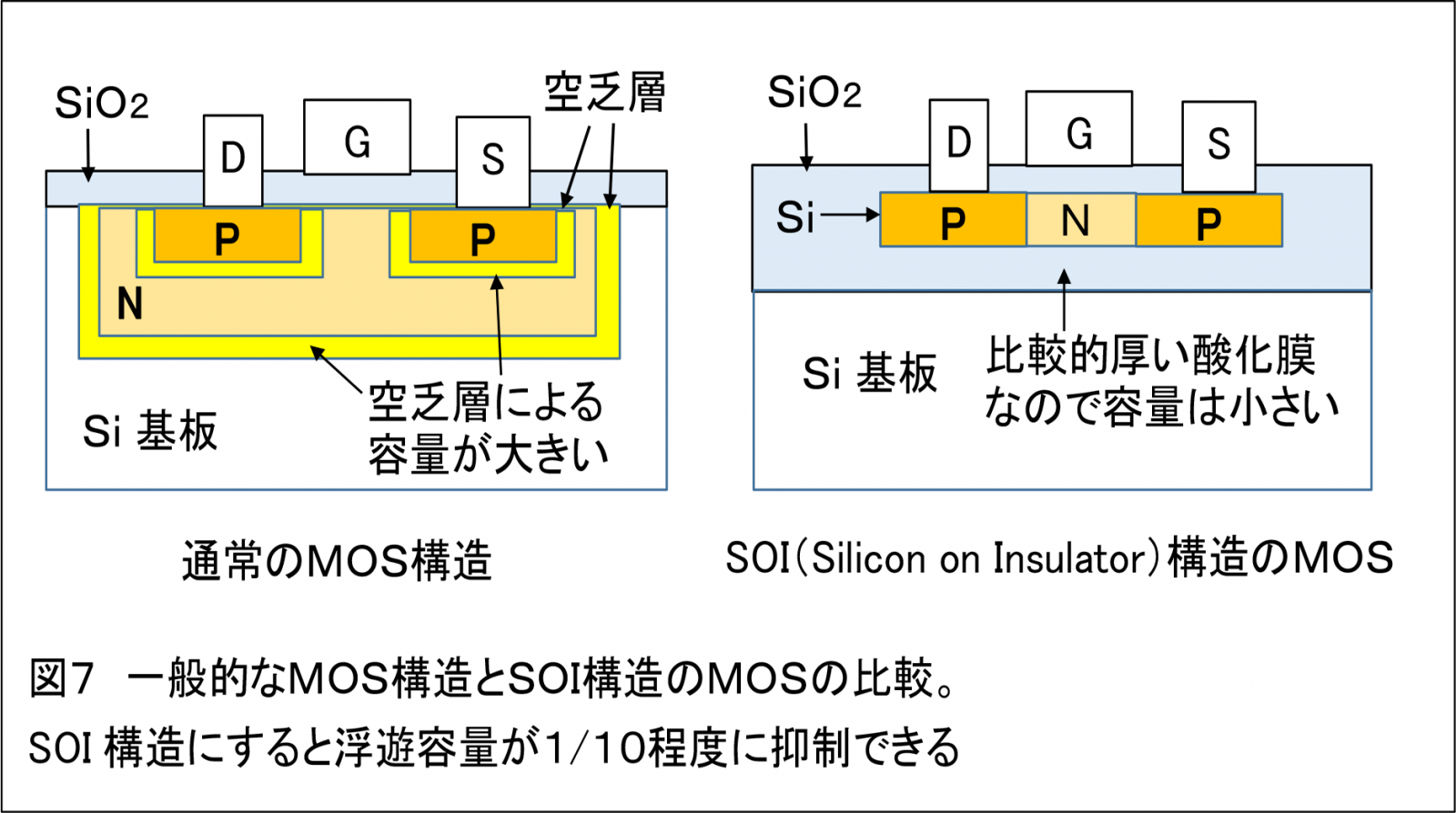 従来のMOS構造では、図7左のように接合の空乏層容量が大きいが、SOI構造だと容量が極めて小さく動作速度が向上する。