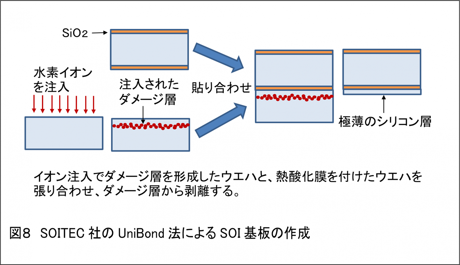 現在、10nmノードのLSIが生産になっているが、SOI構造の場合は15nm程度でもほぼ同等の特性が得られている。 SOIはウエハの製造には凝った方法が必要で、フランスのSOITEC社が開発した図8の方法が用いられている。