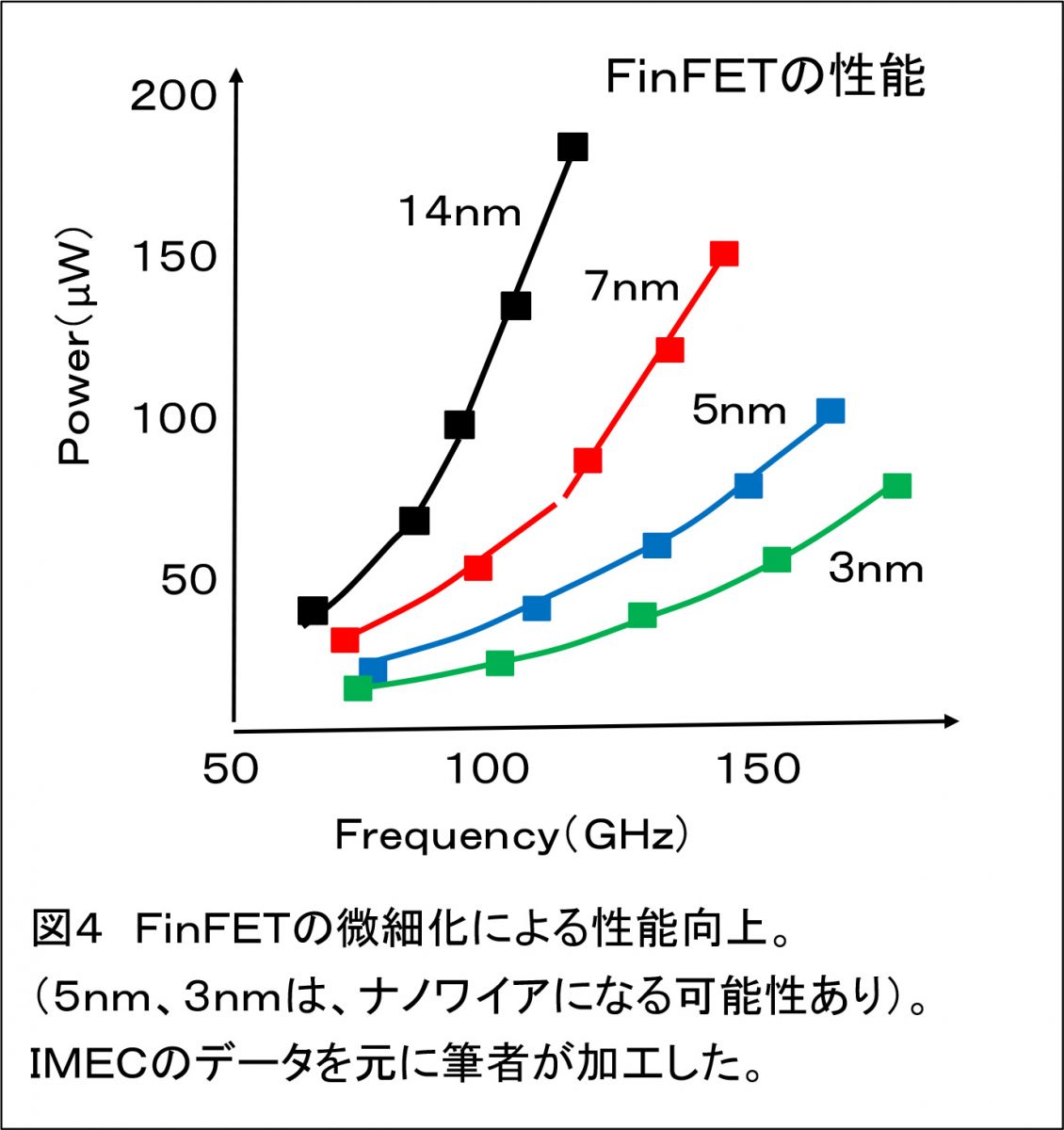 FinFETの微細化が進むと、集積度が上がるだけでなく性能も向上する。比例縮小則に100%従うことは無理だが、消費電力と動作速度の関係は、図4のように向上する。