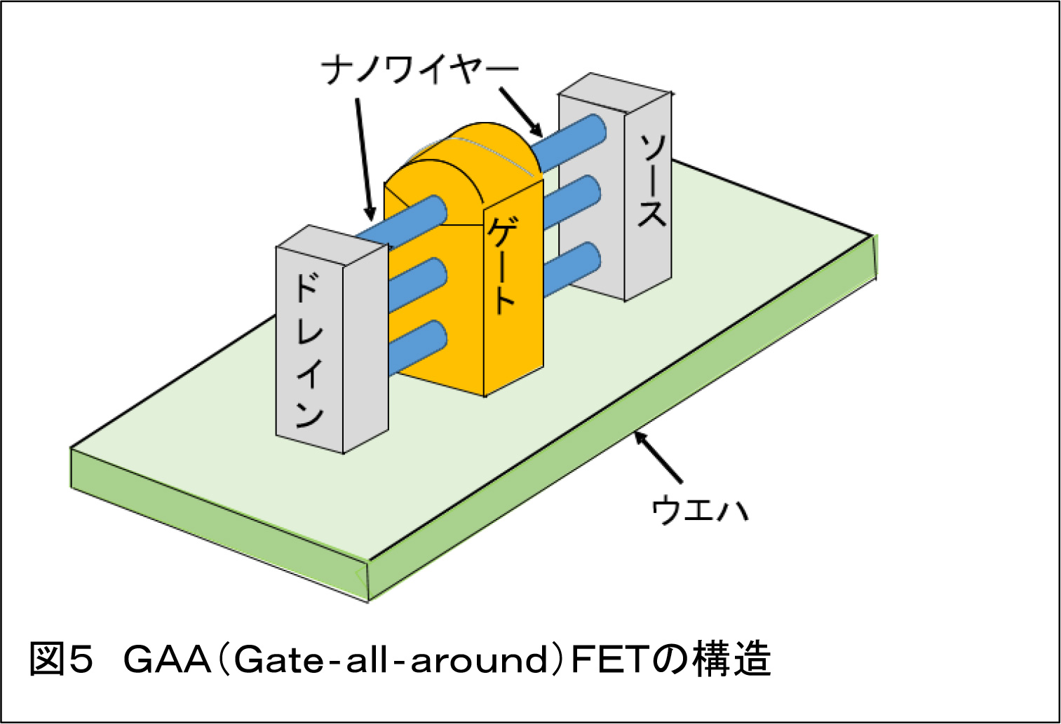 GAAは、図5のように、ナノワイア状のSiチャンネルをゲート酸化膜とゲート電極がぐるりと取り囲む構造になっている。 Siナノワイアは、直径10nm以下(角型もある)が考えられているが、年々微細になると思われる。ナノワイアはゲートからの制御性は優れているが、微細なので電流が多く流せないので、図5のように数本のナノワイアを重ねた構造が考えられている。