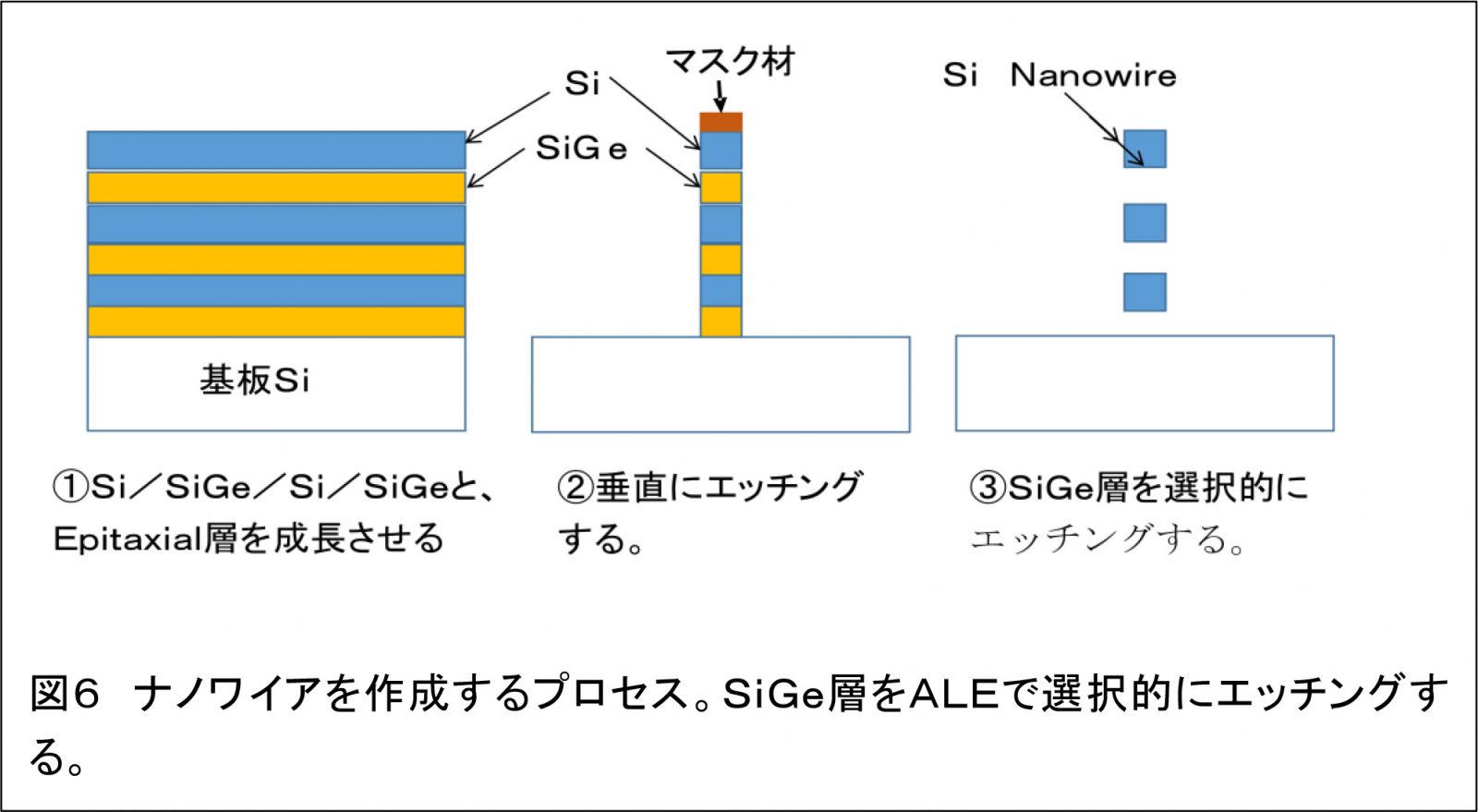 レポートによると比較的簡単に書いてある。すなわち、図6のように、Si/SiGe/Si/SiGeとEpitaxial成長させ、パター二ング&エッチングしてナノワイアになる部分を壁のような構造にし、ソースとドレインの電極を設けて固定した後、SiGe層を選択的にエッチングすれば、Siワイアが残って多層のナノワイアが完成する。と、簡単に書いたが、SiGeのエッチングには、ALE(Atomic Layer Etching)という原子を1層ずつエッチングする手法が用いられ、さらにゲート酸化膜とゲート電極をナノワイアの回りに形成するには、ALD(Atomic Layer Deposition)が用いられている。まさにプロセス技術の粋を集めたデバイスの製法といえる。