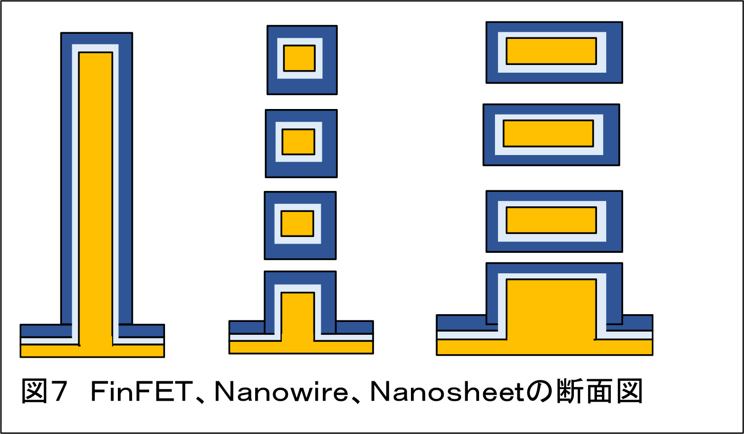 FinFET、ナノワイア、ナノシートの断面図を図7にあげておく。ナノワイアやナノシートでは、10?5nmと微細な上に、側壁だけでなく下側(裏側)にも膜をデポジットしなければならないコンフォーマル(どんな表面にも裏面にも回り込んで膜が付着すること)が必要になるので、かなりプロセスは厄介である。しかし、数年後には量産していると考えられている。