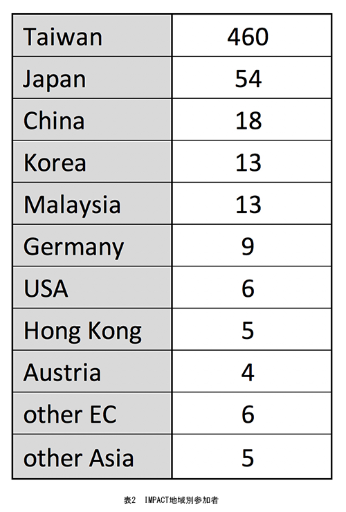 学会参加者は、台湾460名、アジア108名(日本54、中国18、韓国13、マレーシア13、香港5、その他5)、北米欧州25名(ドイツ9、アメリカ6、オーストリア4、その他6)の計593名であった(表2)。