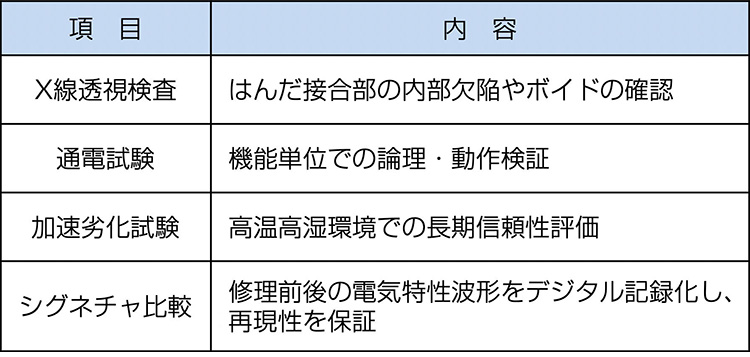 修理の価値を最大化するには、修理後の信頼性を定量的に保証する評価体系が不可欠である。当社では、表2に示す多層的な検査手法を組み合わせ、品質保証体制を構築している。 検査結果は修理報告書としてデータ化し、顧客に対して透明性のあるトレーサビリティ情報を提供している。