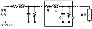 電源コードもアンテナケーブルも電気的な特性を細かく表現すると図4のようになる。ここでのRは電線の導体抵抗、Lは電線のインダクタンス(コイル成分)、Cは電線間のキャパシタンス(コンデンサ成分)、Gは電線間の絶縁抵抗である。LとCは2本の電線の寸法、幾何学的配置と、電線周りの絶縁物質の特性によって決まる。図のR、L、C、Gはいずれも単位長あたりの大きさであり、電源コードもアンテナケーブルもこのようなブロックが連なったものと考える(これを伝送線路と呼ぶ)。