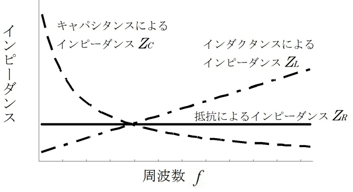 このような線路に交流電圧が印加されると、R、L、C、Gはどれも電流の流れを妨げる『抵抗』として働く。交流に対する抵抗をインピーダンスと呼ぶ(単位は直流抵抗の単位と同じオーム)。R、L、C、Gによるインピーダンスの特徴は周波数特性である。RとGは直流でも高周波でも値が変わらないが、Lは周波数に比例し、Cは周波数に反比例するのである(図5)。