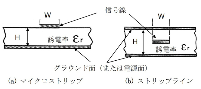 プリント配線板の伝送線路を図6に示す。特性インピーダンスは図の信号線幅W、信号・ラウンド間距離Hおよび誘電率εで決まるので、所定の特性インピーダンスが得られるようこれらのパラメータを調整しなければならない。