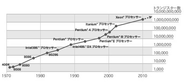 ICの集積度アップの影響について考える。集積度が上がるとは、これまで以上に多くの機能が搭載できる、したがってより複雑・大規模なシステムを1個のIC上に実現できる、ということである。LSI集積度アップの規模とスピードは目覚しい。図7はCPUの集積度アップの推移であるが、最近のCPUのトランジスタ数が20億個に達するのに驚く。