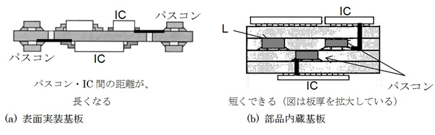 部品を内蔵することによるメリットは、①実装基板の小型化・高密度化、②パワーインテグリティの向上、である。