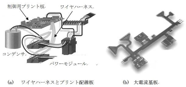 産業用ロボット、ハイブリッドカー、電気自動車など大電流を必要とする分野が広がってきている。従来、大電流を扱う用途は変電所、工場動力設備、公共施設、鉄道など、産業用のシステムが主であった。これら設備の配線は通常システムごとに異なっているので、設置現場で熟練作業員が図面を見ながら組み立てていた。大電流用の配線には太い電力ケーブルやバスバー(銅板を打ち抜いて成形した帯状の導体)が用いられる。自動車など、配線本数が多く、数がまとまる装置にはワイヤハーネス(複数の電線を束にした集合部品)が用いられている。自動車の場合、大電流はワイヤハーネス(あるいはバスバー)を用いて配線し、制御系の配線はプリント配線板を用いて行われている(図13-a)。このワイヤハーネスによる配線をプリント配線板で置き換えようというのが大電流基板である(図13-b)。