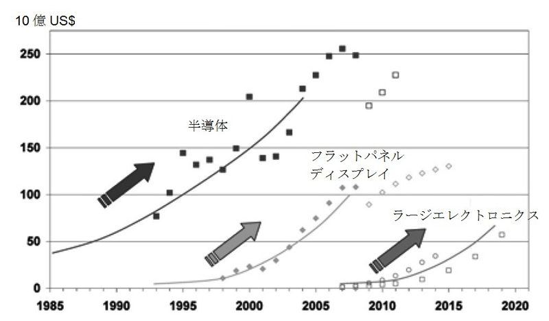 入出力装置とCPU・メモリの違いは、CPU・メモリで扱うのは論理値(1と0)だけなのに対し、入出力装置には相手(自然、環境、人間)があり、相手に応じた物理量を扱う必要があることである。太陽電池では受光面積が大きいことがまず求められ、各種ディスプレイもその大きさで競う。センサは対象物理量に応じた原理、構造、寸法でなければならない。CPU・メモリはその性能アップとスケーリングによる集積度アップでコストダウンを実現してきたが、入出力系の装置の場合は相手の条件を満たしながら性能アップ、コストダウンをはかる必要があるのである。そこに登場してきたのがラージエリアエレクトロニクス(あるいはプリンテッドエレクトロニクス)である。