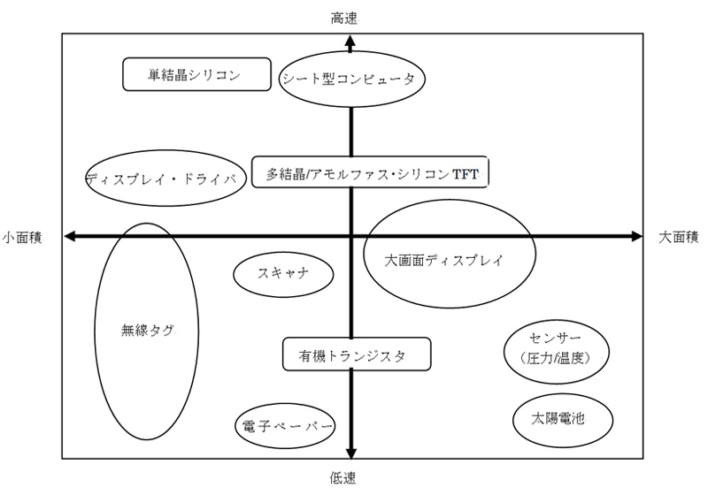 しかし課題も多い。上記のような高機能のデバイスが作れる基礎技術はかなり開発が進んでいるが、低コストで大量生産できる目途はまだついていない。特に能動素子(有機トランジスタ)の低コスト生産の課題は大きいと思われる。図15は有機トランジスタのターゲットを示したものである。有機トランジスタのターゲットは動作は高速でなくてもよいが大面積の用途とされている。 ラージエリアエレクトロニクスのもうひとつの課題は現行の無機デバイスとのコスト競争である。現在、シリコンICを搭載したICカードやRFIDが大量に使用されている。そのICカードで、チップ面積はカード面積の1%にも満たない。シリコンチップを使用するICカードではチップを基板に実装するコストが別にかかるが、競争は結局トータルコストの競争となろう。太陽電池やディスプレイはデバイス全体が機能素子なので、ラージエリアエレクトロニクスのもっとも有力なターゲットとなるであろうが、この分野でもさまざまな方式が開発され、一部実用化されているので、ここでもコスト競争力が成否を決めることになる。ラージエリアエレクトロニクスの要素技術のさらなる発展が期待される。