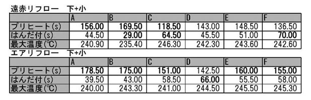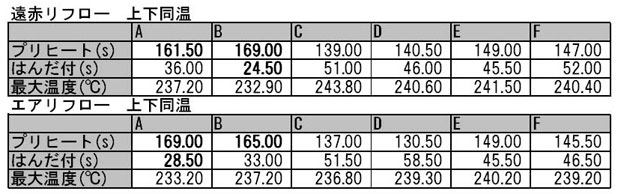 部品とプリント基板の間の温度測定結果では、プリヒート時間が規定値を超えてはんだ付時間がほかの測定ポイントより低い。したがって、他の測定ポイントがはんだ付け温度に達した時点では、部品とプリント基板の内部ではまだプリヒート状態を保持しており、フラックス内の溶剤が十分気化されない状態ではんだ付け温度になるが、はんだ付け時間が短くなっていることが確認できた。
