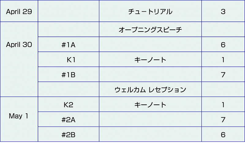 計162名の参加者が集まり、29日は計9件チュートリアルで3セッション、30日朝、主催者TJ Green AssociatesのThomas Green氏のオープニングスピーチの後(写真1)、2日目と3日目には2つのキーノートと4つの技術セッションの中で、プレゼンテーションと実装討議がなされた(表1、表2)。