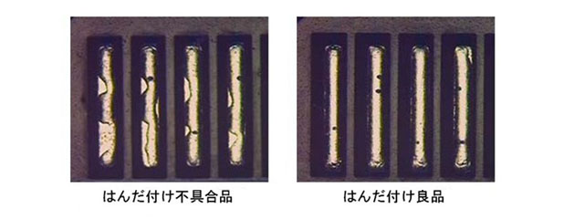 不具合の大半は、コート厚の薄化による金属間合物層の露出が原因で発生するはんだ不ぬれである(図7)。はんだ/Cu間に形成されるCu−Sn化合層の酸化物は、電気化学的に卑な還元電位を示すことから、酸化物として安定ではんだ付け性を阻害する6)。したがって、レベラの最低厚み(1~2μm)を規定する必要がある7)。特にファインパターン設計面では、レベラ処理時のパッド間ショート防止のためにレベラ厚を薄くする傾向があり、注意を要する。