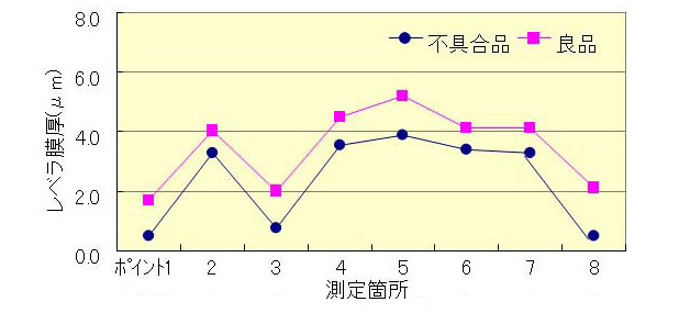 図8に、レベラ基板ではんだはじきが発生した時のレベラ厚を示す。はんだレベラは、溶融はんだへのディップ法で形成されるため、測定個所によってレベラ厚は大きく異なるが、不具合基板は全体的に薄く<1μmのパッドも存在した。