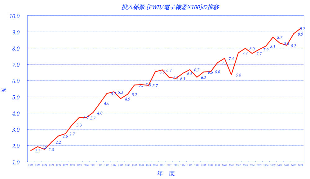図3と図4のデータを使って加工すると、図5に示す投入係数の推移が得られる。