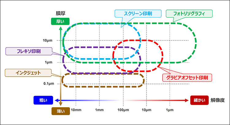 図7 電子回路形成技術ごとの解像度と膜厚の関係