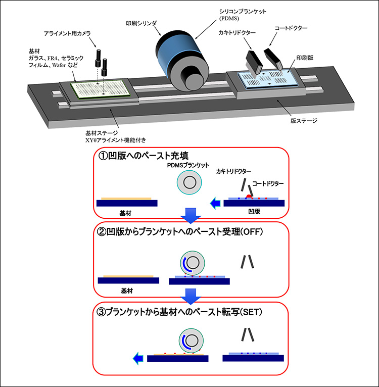 『PEPIO』の構成と印刷工程を図8に示す。印刷工程は、ディスペンサでペーストを凹版へ供給し、コートドクターで凹版表面にペーストを広げて溝を充填、余剰ペーストをカキトリドクターで除去した後、ペーストをPDMS (ポリジメチルシロキサン)ブランケットに一度“受理(OFF)”してから基板へ“転写(SET)”する方式である。PDMSは表面エネルギーが低いため離型性が高く、同時にブランケット側で溶剤を選択吸収してペーストに粘度勾配を生み半固化するため、基材側への完全転写が起こりやすく、にじみ(ブリード)を抑えた微細パターンを得られる。凹版素材はガラスエッチングやニッケル電鋳などのリジッド版を用いるため版の伸びがなく、カメラアライメントとの組み合わせで位置精度の高い重ね印刷に向いている。