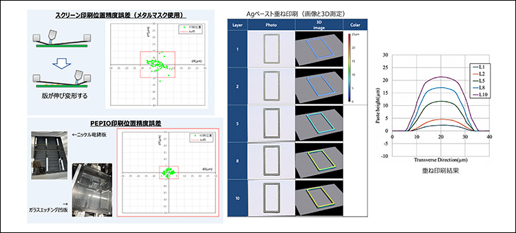 図9は、『PEPIO』の印刷位置精度に関しスクリーン印刷と比較した印刷結果である。同一ターゲットの印刷位置精度誤差は、スクリーン印刷の場合±11μm(3σ)に対し、『PEPIO』は±5um(3σ)を達成する。さらに、『PEPIO』の高い印刷位置精度を応用し、Agペーストを用いて同じ形状位置に重ね印刷をした結果を図9に併せて示す。10回の重ね印刷により、厚み20μmの膜厚を達成する。この印刷特性を生かし、当社は微細部品の高密度化実装を想定した狭ピッチはんだバンプ形成をグラビアオフセット印刷で行う技術開発と提案を進めている。